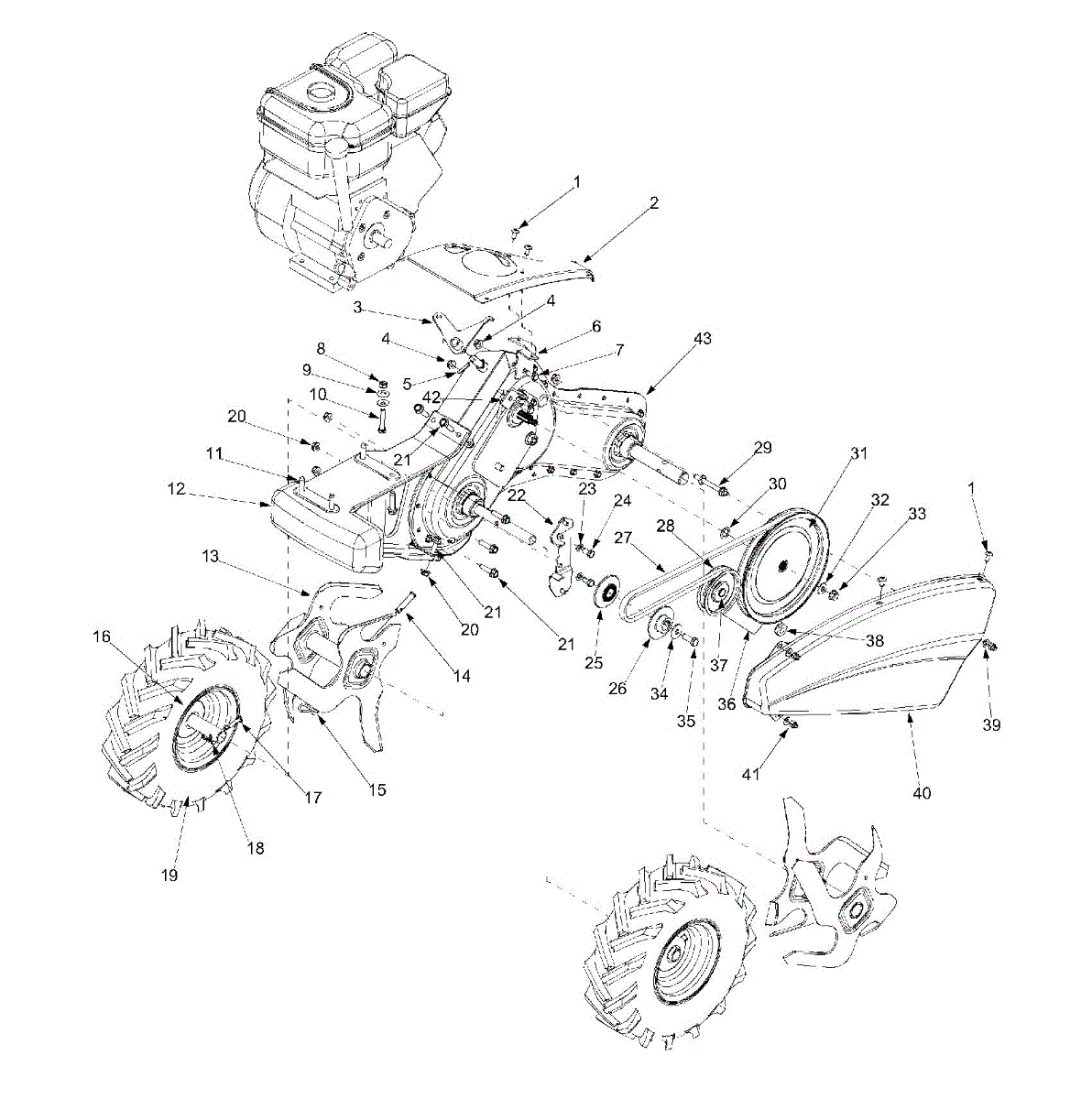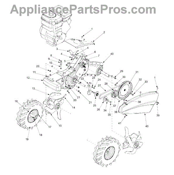 Complete wheel assembly for rear-tine tillers. Replaces damaged, cracked, or worn wheels. Includes all components for full wheel replacement.