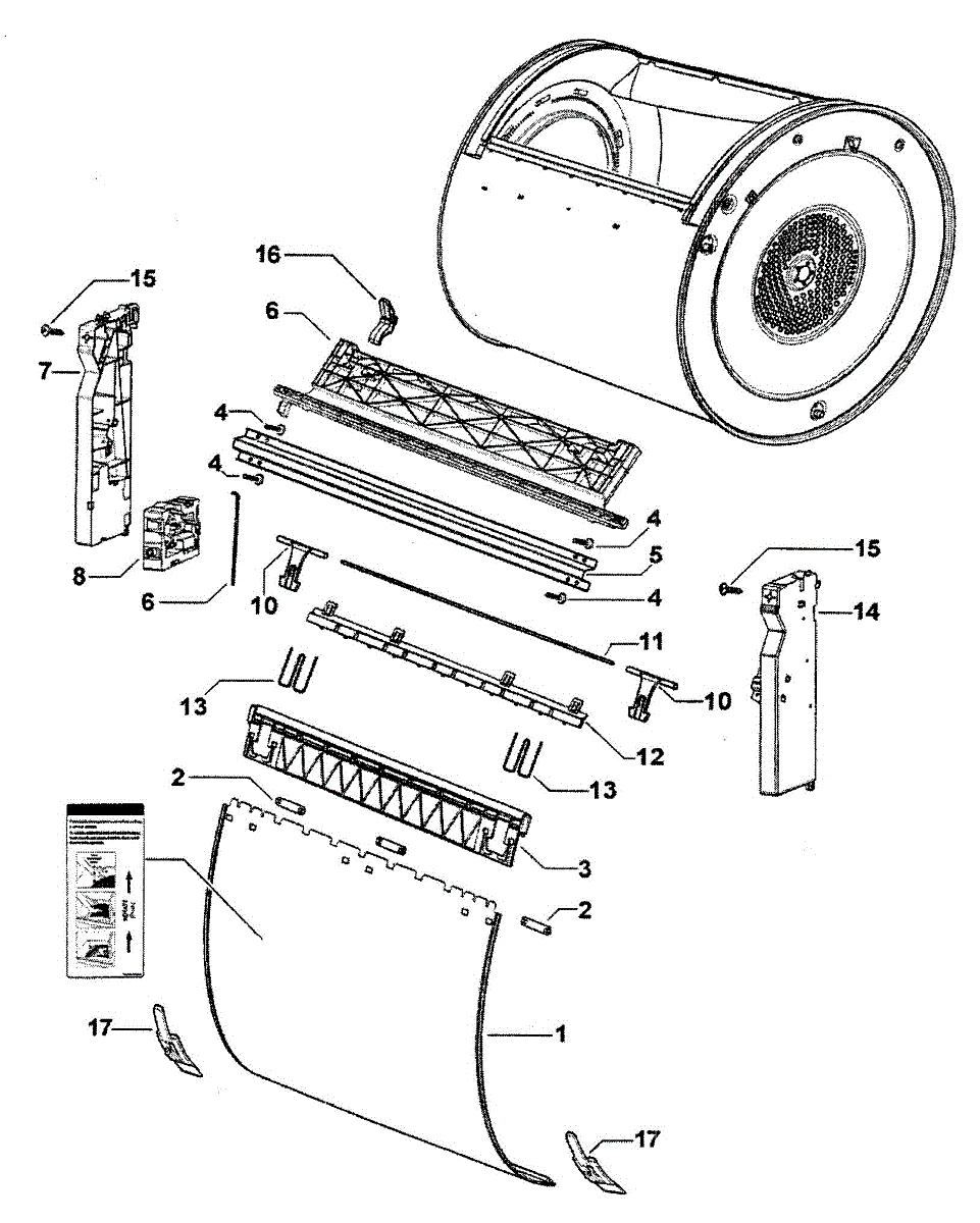 Cushion pads that reduce noise and prevent metal-on-metal contact between drum and door. Replace when worn to restore quiet operation. Verify fit.