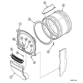 This front bulkhead assembly forms the dryer's front drum support and air seal. Replacing a worn or damaged bulkhead restores smooth drum rotation, reduces noise, and helps maintain proper airflow for consistent drying performance.