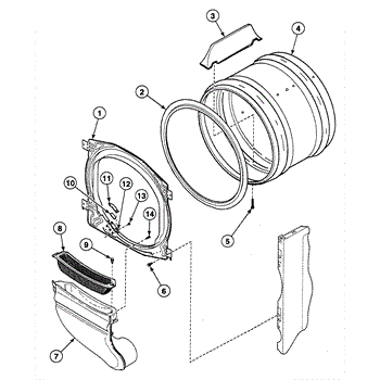 This front bulkhead assembly forms the dryer's front drum support and air seal. Replacing a worn or damaged bulkhead restores smooth drum rotation, reduces noise, and helps maintain proper airflow for consistent drying performance.