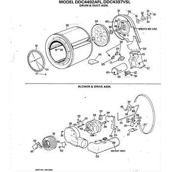 Ground strap assembly connects drum shaft to dryer frame for electrical safety. Replace if damaged, corroded, or causing startup squealing noise.