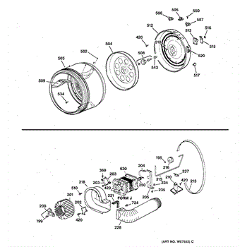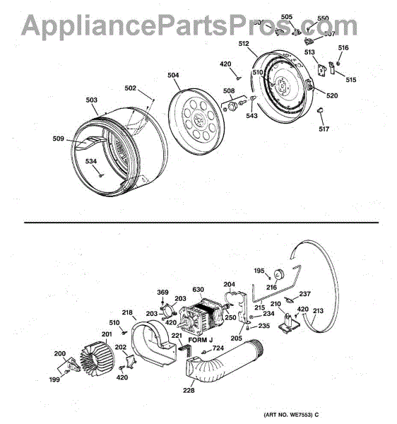 The Blower Wheel is an OEM replacement part for GE dryers. It has a role in the air circulation within the dryer, aiding in the even and efficient drying of clothes. The blower wheel, connected to the motor, helps in expelling the moist air out of the dryer through the exhaust vent during the drying cycle. Causes of a malfunctioning blower wheel are typically wear and tear from regular use, the accumulation of lint or debris, or damage to the wheel’s fins or central hub, which can impact its rotation and air circulation capability. Symptoms of a bad Blower Wheel include:
