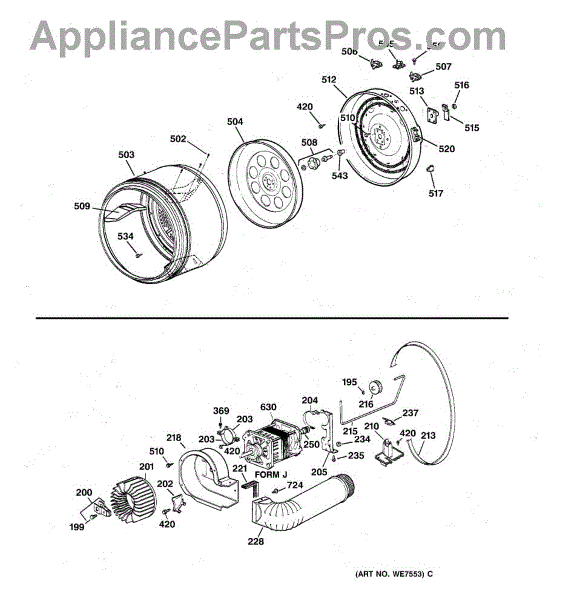 The Blower Wheel is an OEM replacement part for GE dryers. It has a role in the air circulation within the dryer, aiding in the even and efficient drying of clothes. The blower wheel, connected to the motor, helps in expelling the moist air out of the dryer through the exhaust vent during the drying cycle. Causes of a malfunctioning blower wheel are typically wear and tear from regular use, the accumulation of lint or debris, or damage to the wheel’s fins or central hub, which can impact its rotation and air circulation capability. Symptoms of a bad Blower Wheel include: