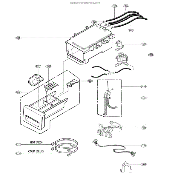 Directs water from inlet valve to detergent dispenser in LG washers. Replace if hose is cracked, leaking, won't stay attached, or damaged from wear.