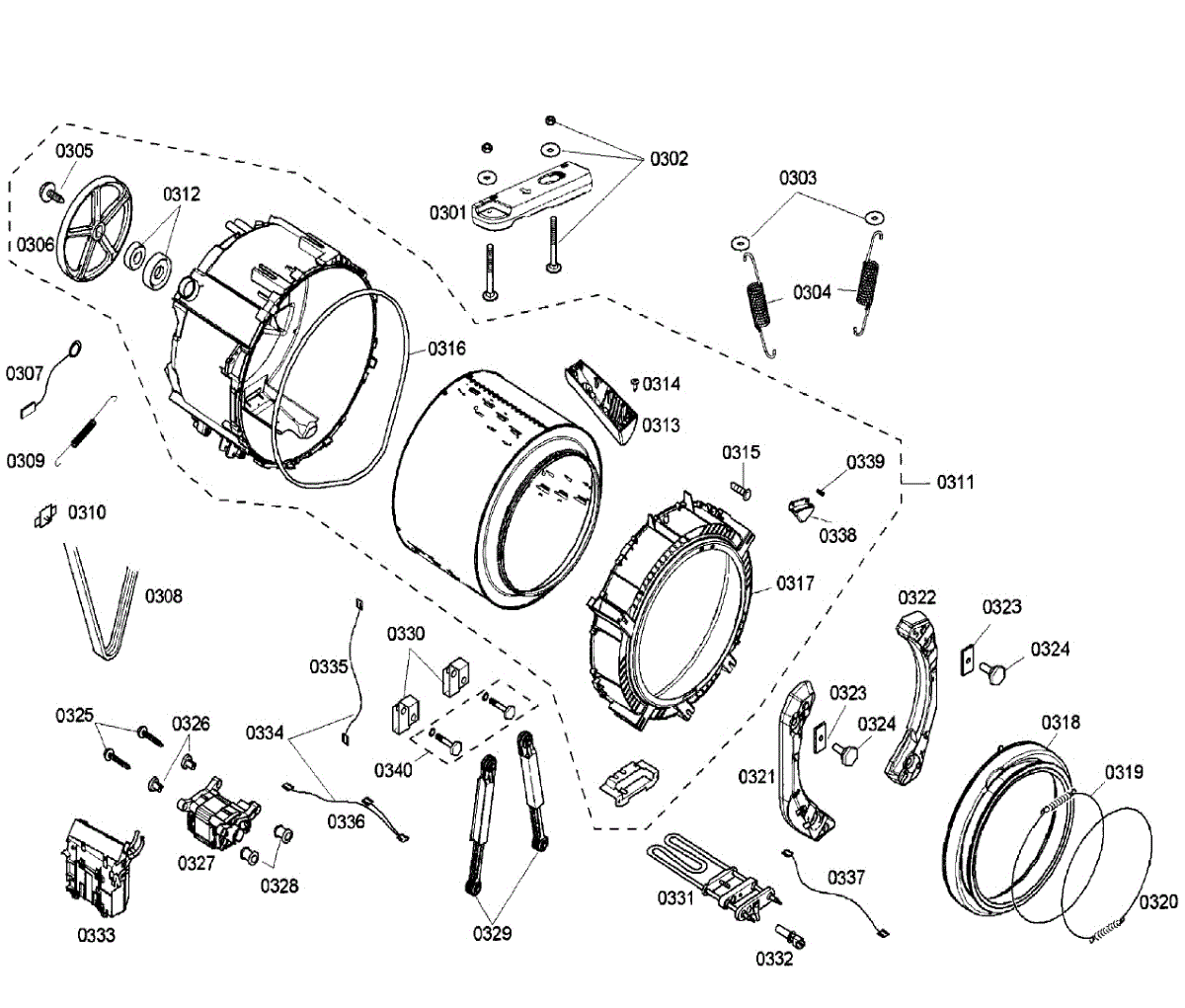 The Tank Spring is an OEM part for Bosch washing machines. It is located within the central support assembly below the washer tub. The spring provides counterbalancing tension to assist the tub during movement and rotation.