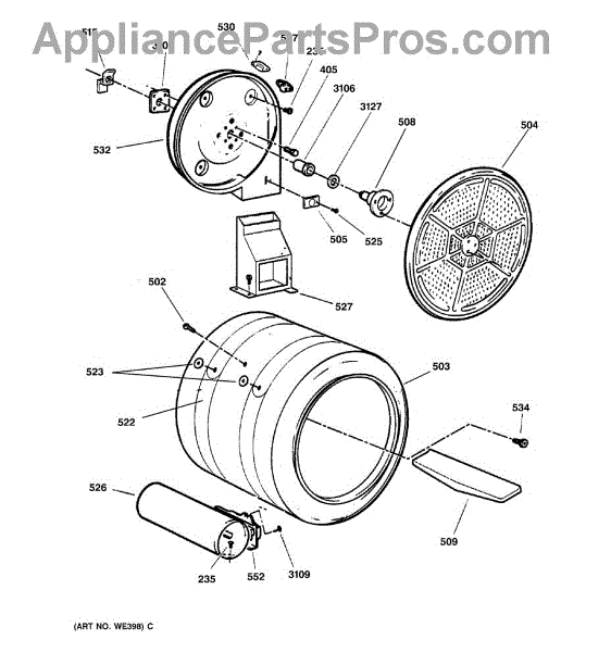 You should replace the rear drum bearing sleeve if it becomes worn out or damaged. Causes of a bad bearing sleeve can include regular wear and tear, lack of lubrication, or excessive loads that cause undue stress on the component. A malfunctioning bearing sleeve can lead to increased friction, noise, and potential damage to other parts of the dryer.