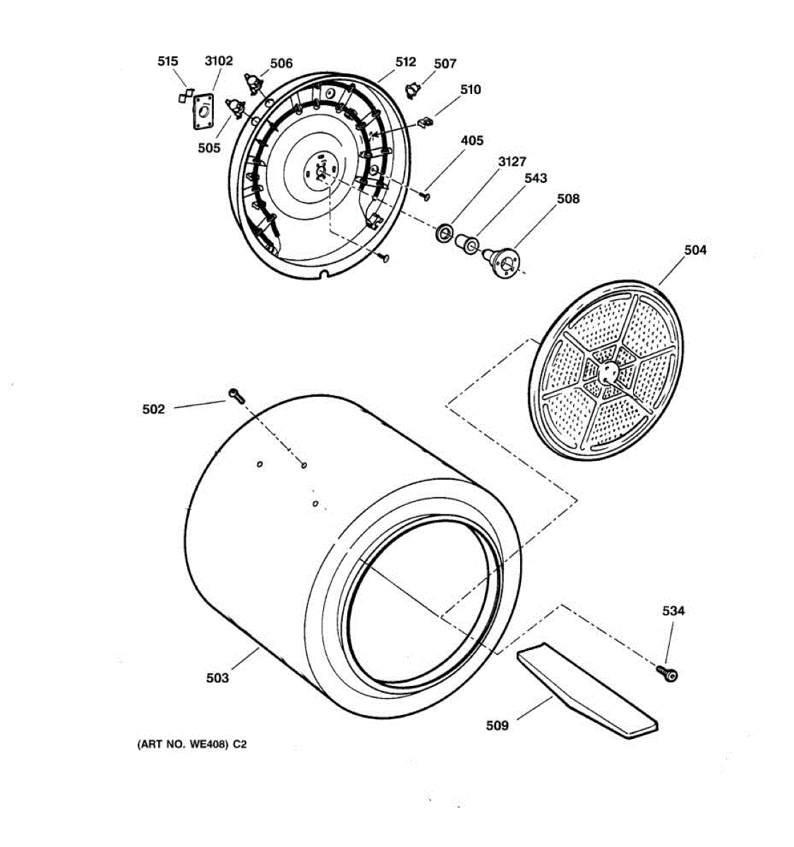 Replacement drum assembly for dryers. Installs as the rotating cylinder that tumbles clothes. Needed when drum is cracked, damaged, or worn out.