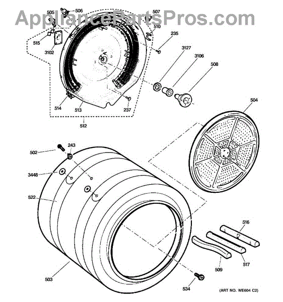 Supports the rear dryer drum for smooth, quiet rotation. Replace if you hear squeaking, screeching, or thumping during cycles. Verify fit with your model.
