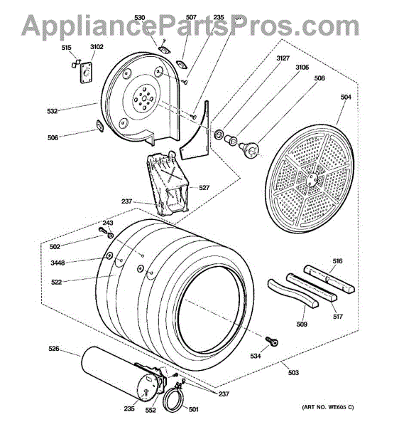 Seals the drum bearing assembly to prevent air leaks and maintain drying efficiency. Replace when worn, cracked, or if dryer is noisy. Confirm fit with model.