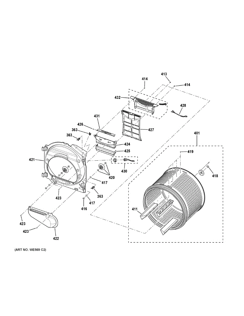 Replacement dryer drum assembly with front bulkhead. Installs as the main rotating drum that tumbles clothes. Needed when drum is cracked, dented, or worn.