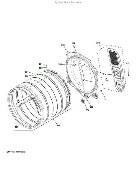 This replacement dryer drum is the rotating tub that holds clothes and allows tumbling during the dry cycle. Replacing a worn or damaged drum restores smooth rotation and helps eliminate rubbing or scraping noises. What it does
