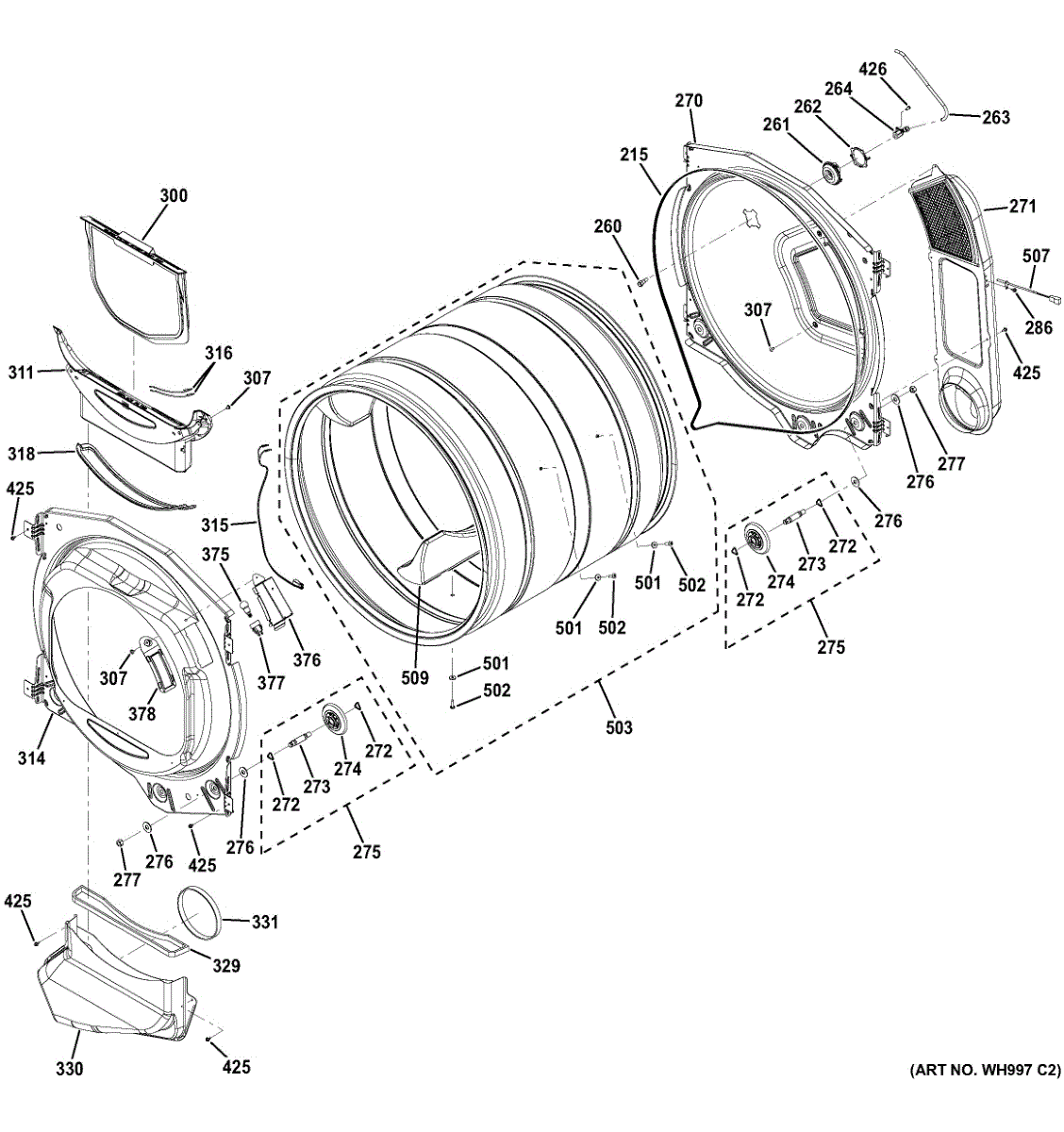 Complete dryer drum assembly that rotates clothes during drying cycles. Replace if drum wobbles, makes noise, or won't turn. Confirm fit with your model.