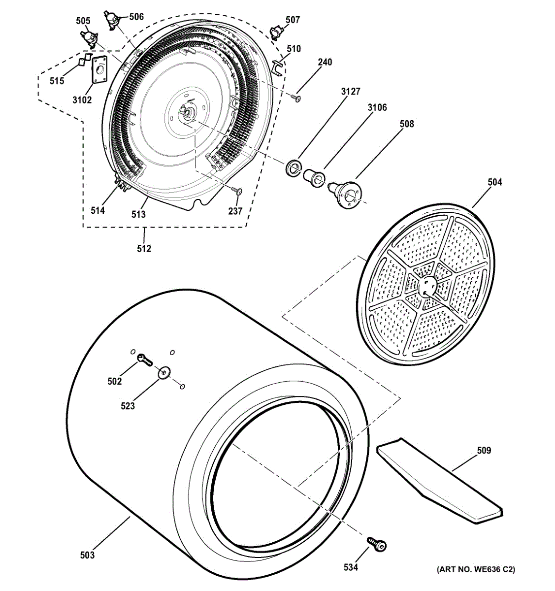 Complete drum assembly for your dryer. Replaces cracked, damaged, or worn drum that needs replacement. Installs inside dryer cabinet to hold clothes.