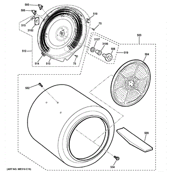 This drum assembly is the rotating tub that holds clothes and provides the tumbling action in the dryer. Replacing a worn or damaged drum restores proper rotation and helps prevent rubbing, noise, and garment damage. What it does:
