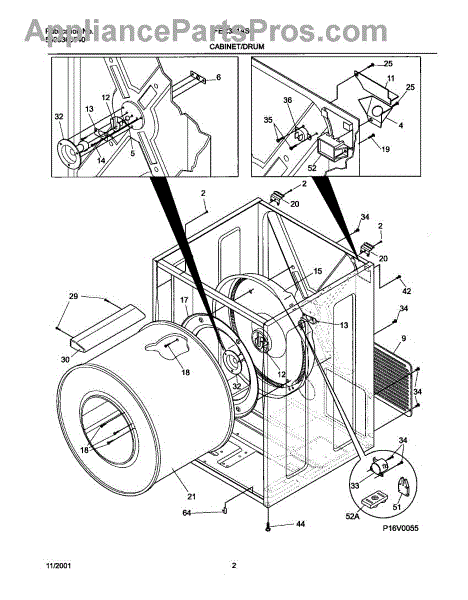 The Rear Drum Bearing Kit is an OEM replacement part for Frigidaire dryers. It contains a set of parts responsible for supporting the rear end of the dryer drum, allowing it to rotate smoothly and efficiently during the drying cycle.