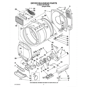This front drum bulkhead is the stationary front panel that supports the dryer drum and seals the drum opening to maintain proper airflow and drum alignment for reliable drying performance. What it does: