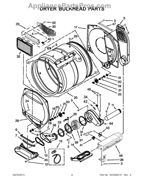 This front drum bulkhead is the stationary front panel that supports the dryer drum and seals the drum opening to maintain proper airflow and drum alignment for reliable drying performance. What it does: