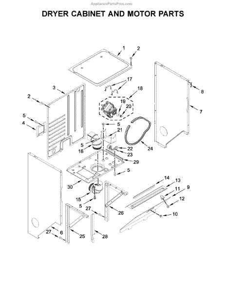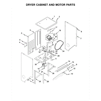 This top panel is the dryer cabinet's upper cover that protects internal components and provides a finished appearance. It restores a flush, stable surface and helps keep lint and moisture away from internal parts. What it does: