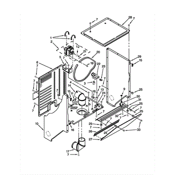 This top panel is the dryer cabinet's upper cover that protects internal components and provides a finished appearance. It restores a flush, stable surface and helps keep lint and moisture away from internal parts. What it does:
