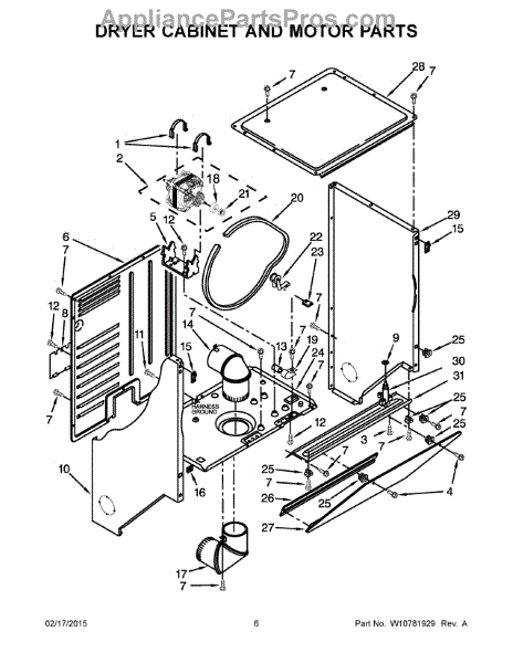 This top panel is the dryer cabinet's upper cover that protects internal components and provides a finished appearance. It restores a flush, stable surface and helps keep lint and moisture away from internal parts. What it does: