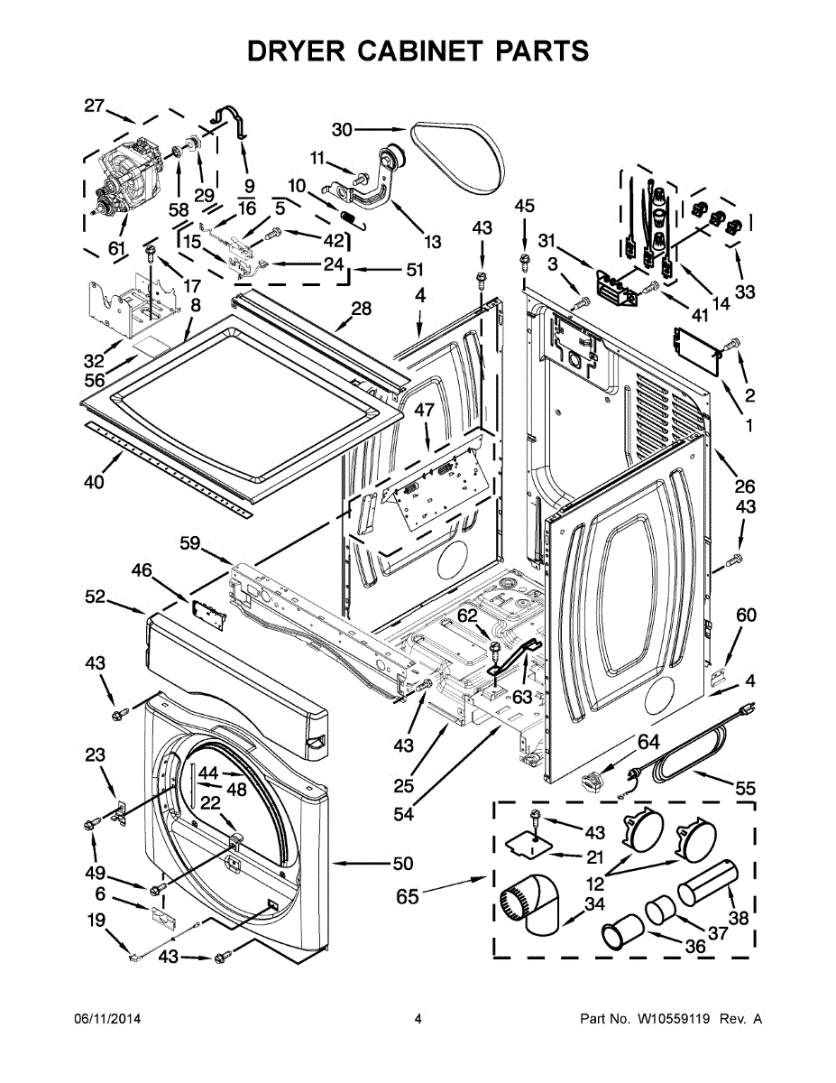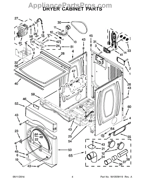 Directs heated air from dryer drum to household vent. Replace if cracked, damaged, or airflow is restricted. Confirms fit for compatible dryer models listed.