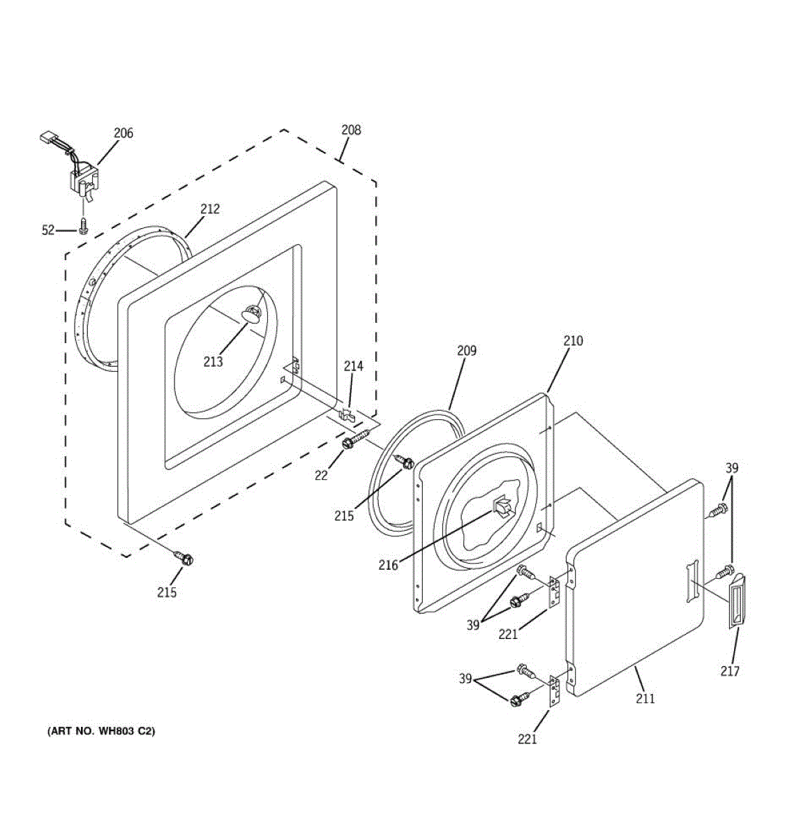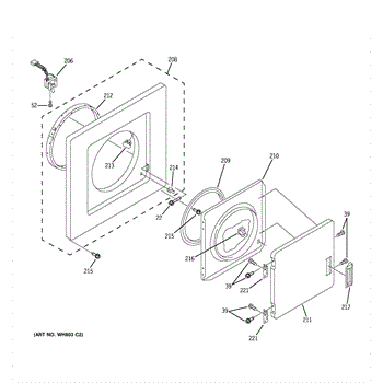 White front door assembly for dryer and washer dryer combo units. Replaces cracked, broken, or worn doors. Restores cosmetic appearance and structure.