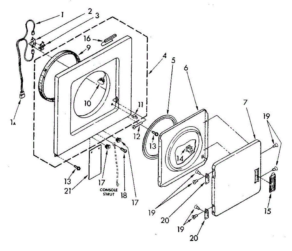 Secures and guides the dryer door, acting as the pivot point. Replace if pin is worn, bent, or broken to restore proper door alignment and smooth operation.