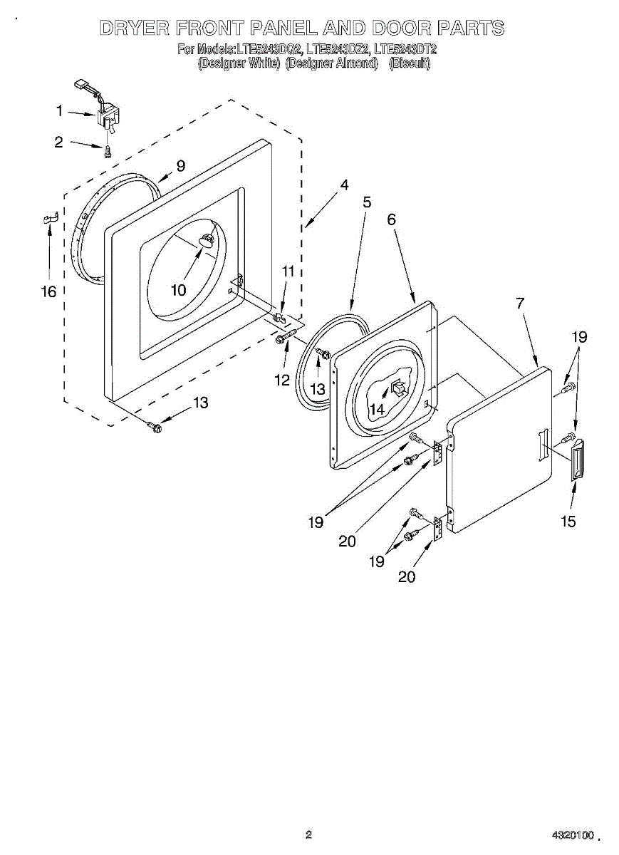 Parts for Whirlpool LTE5243DT2: 02 - Dryer Front Panel And Door Parts