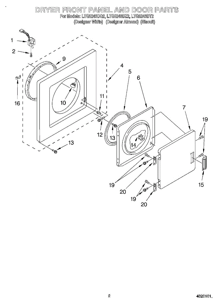 Parts for Whirlpool LTG5243DZ2: 02 - Dryer Front Panel And Door Parts