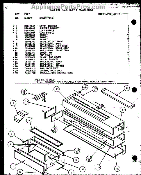 Parts for Amana CBK415B1/P6476305R: Duct Kit (Main Duct & Transition) (Mdk01 / P9846801rx) Parts