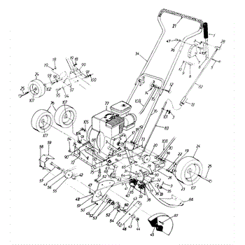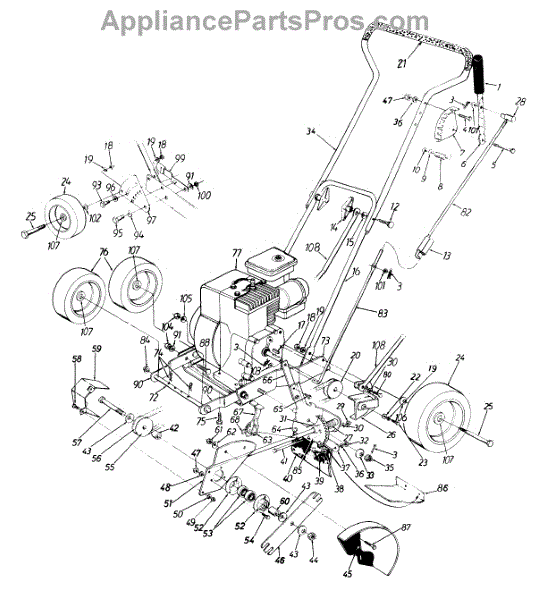 This is the front wheel assembly that is used by a large number of manufactures as the standard wheel for push mowers. This wheel is a tough, black rubber wheel fitted onto a sturdy white chassis. Since it is not a pneumatic wheel, there is no concern that it will roll over hidden debris and be damaged. Push wheels such as these often last the lifetime of a Lawn Mower. However, there are occasions when the housing of the mower is dropped and the wheel becomes warped or broken. It's also the case that, with constant use, the wheels can lose tread, making them harder to maneuver in tough mowing conditions. It has also been reported that the tires will wear and become smaller in circumference over time, meaning it will require more gasoline to mow the same amount of yard. The front wheels are easily replaced. After removing the plug cap and stabilizing the mower, simply use a socket wrench to remove the center bolt from the wheel. It's a good idea to use a dry lubricant like graphite on the axle before replacing it. This OEM guaranteed replacement part is compatible with Ryobi, Yard Machines, Troy-Bilt, Cub Cadet, Husky, Yard-Man, and MTD push mowers.