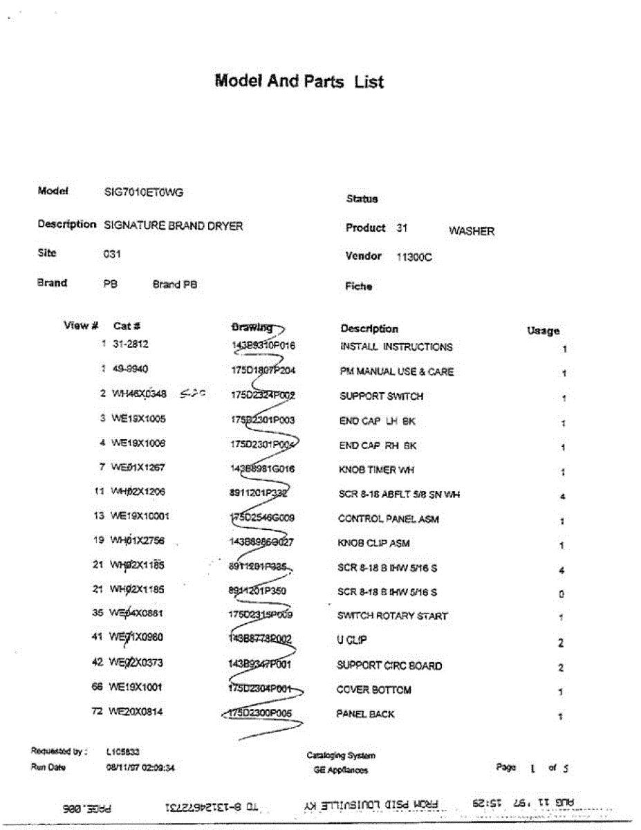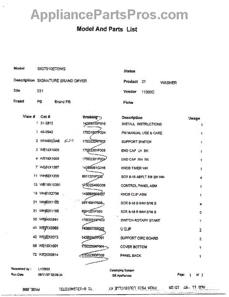 Parts for Ge SIG7010ET0WG: Electric Dryer Page 5 Parts