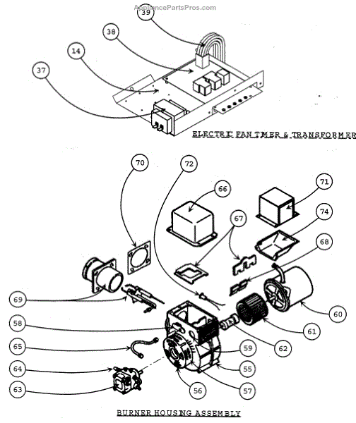 Parts for Carrier 58CLA10510112: Electric Fan Timer / Transformer / Burner Housing Assy Parts