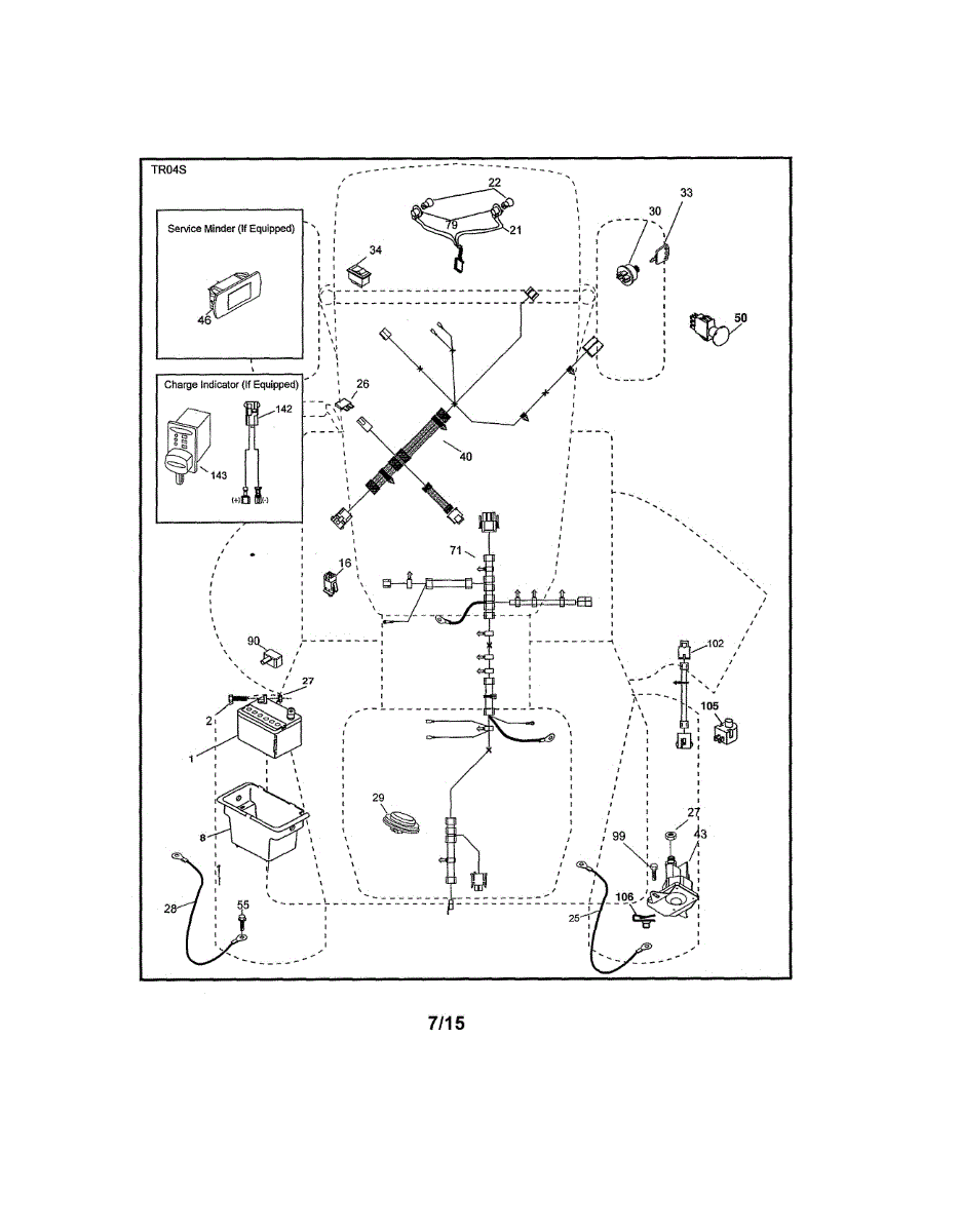 Rear chassis wiring harness for riding lawn tractors. Connects battery and electrical components at the rear of the tractor. Replace if cracked, frayed, or corroded.