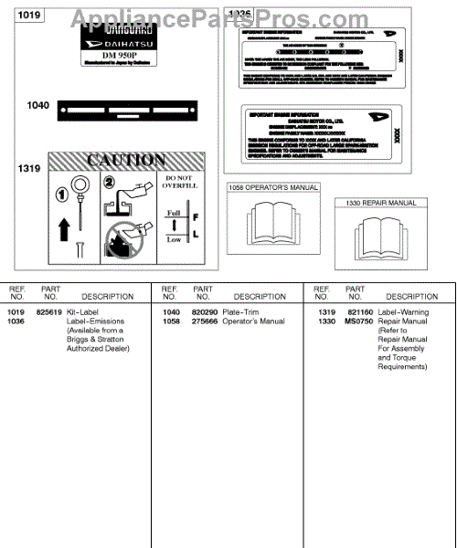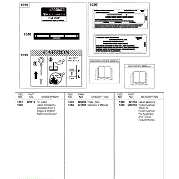 Parts for Briggs & Stratton 581447-0375-E2: Emissions Label, Label Kit, Repair Manual Parts