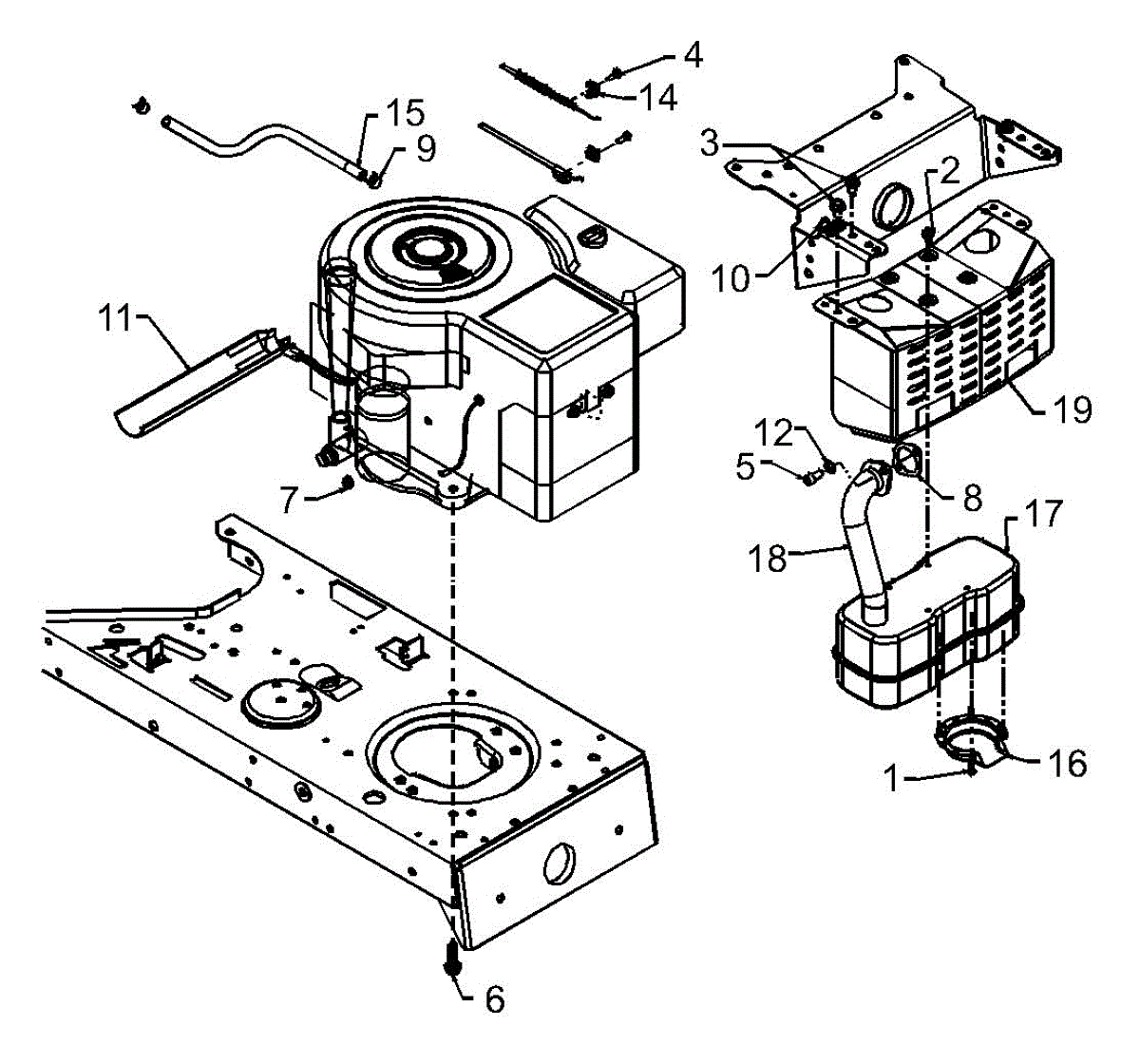 Hex screw fastener for securing lawn mower components. Replace if stripped, rusted, or missing to ensure proper assembly and equipment stability.