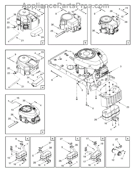 Exhaust muffler for lawn mowers and tractors. Reduces engine noise during operation. Replace if cracked, rusted, or excessively loud from wear or damage.