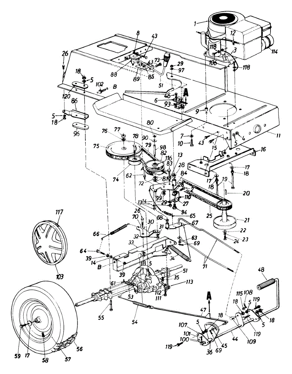 Self-tapping screw for lawn mowers and garden equipment. Secures metal, wood, and plastic parts. Replace if stripped, missing, or corroded.