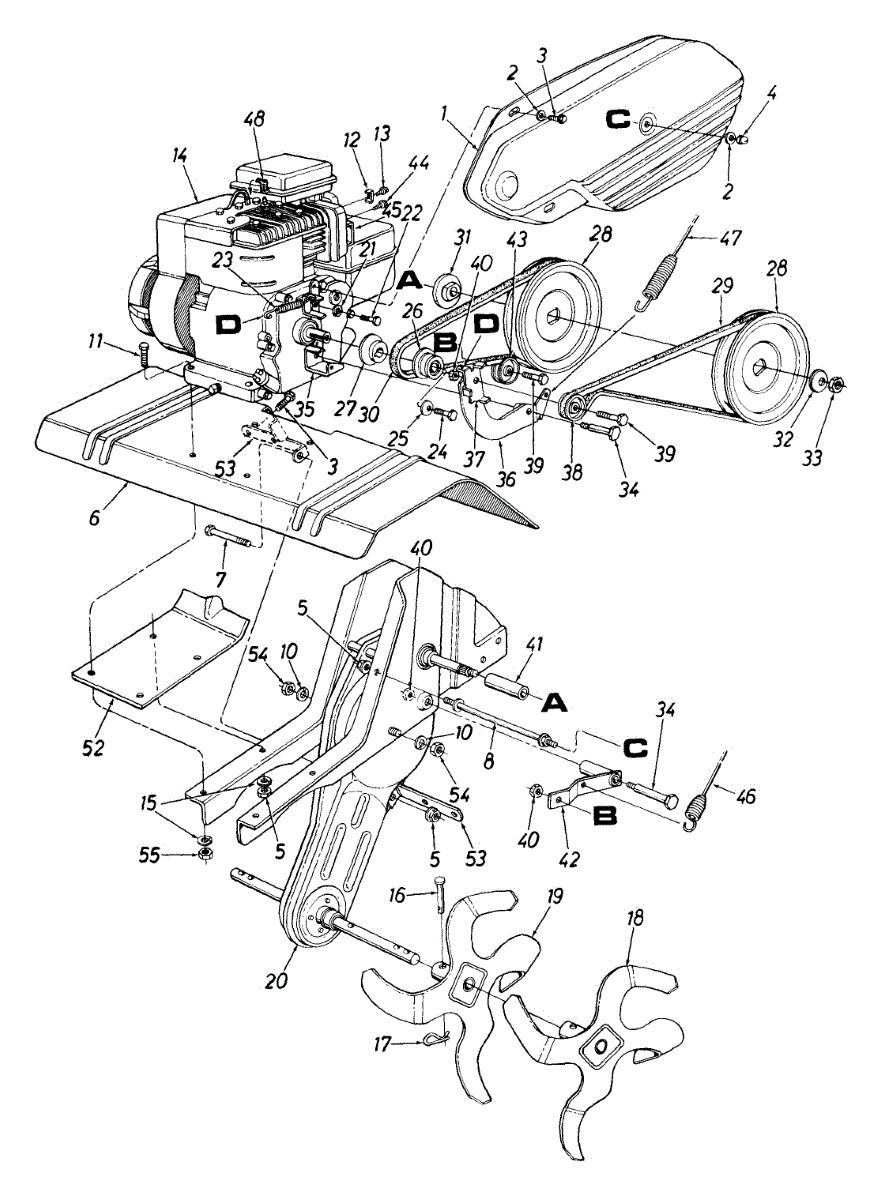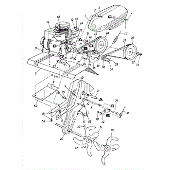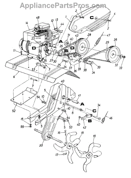 Drive pulley for front-tine tillers. Mounts to the engine or transmission to transfer power. Replace if cracked, worn, or wobbling affects operation.