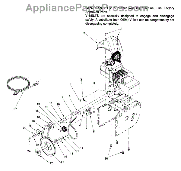 This v-belt is a genuine MTD part, sold individually. This v-belt can be used as a replacement part for a snowblower. The purpose of a v-belt is to facilitate the rotation of the auger and the wheels so the snowblower can move over surfaces and blow snow out of the way of the operator and off of surfaces.The v-belt might have to be replaced in the event that it suffers damage to the point that it can no longer facilitate the rotation of the augur or of the wheels. If the v-belt has been compromised from a puncture, tear, rip, scrape, or sufficient erosion rendering it beyond functionality, the component should be removed and replaced by this genuine OEM replacement part before using the snowblower again. Remember to always wear gloves when handling, repairing, and operating outdoor equipment.This is an OEM part sourced directly from the manufacturer. It is sold individually. This v-belt is compatible with the following outdoor appliance brands: MTD, Craftsman, Ryobi, Troy-Bilt, Yard Machines, Huskee, Montgomery Wards, Bolens, and Yard Man.