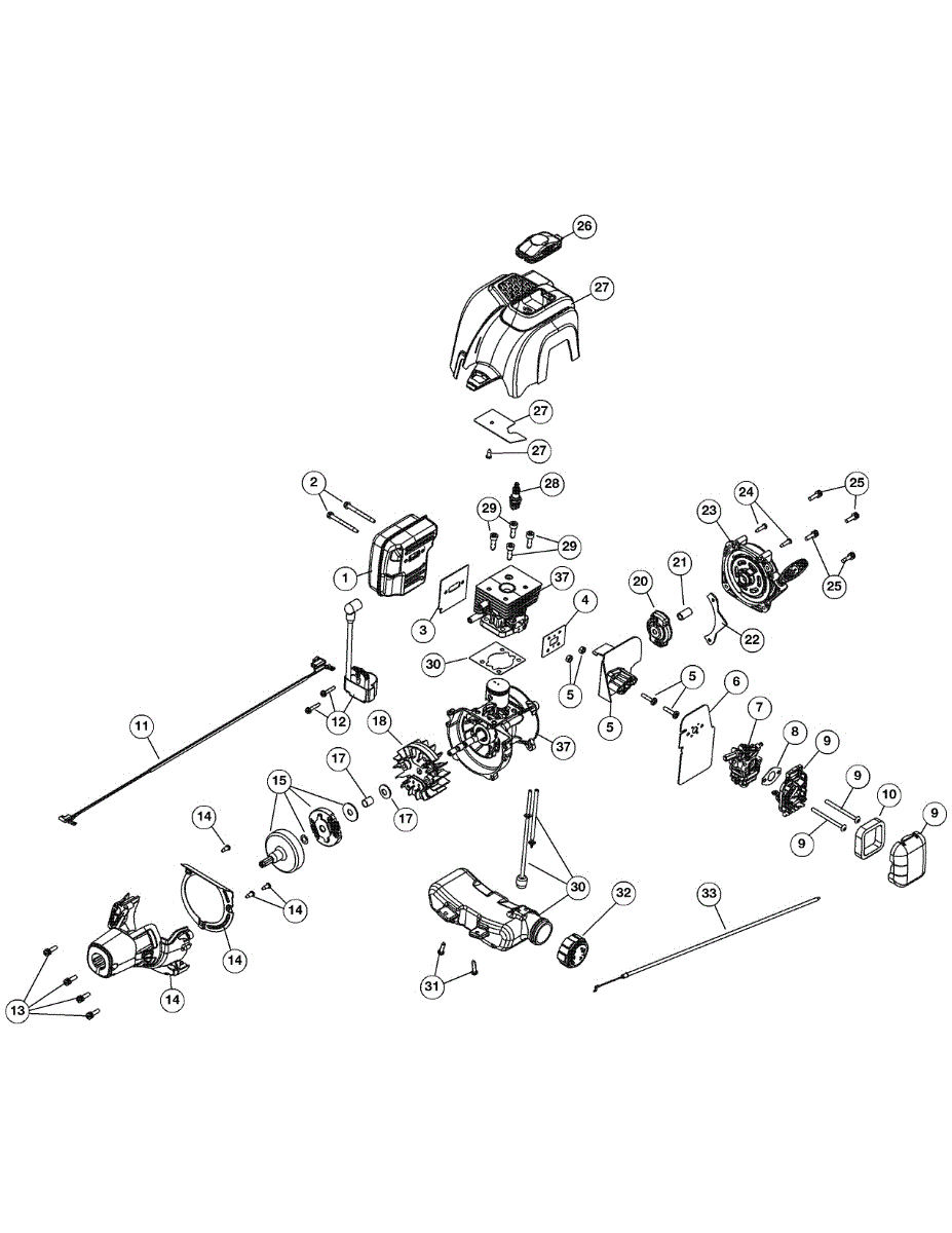 Complete fuel tank assembly for gas line trimmers. Includes molded tank, gas cap, primer leads, fuel lines with filter, and mounting screws. Replace cracked, leaking, or damaged fuel tanks.