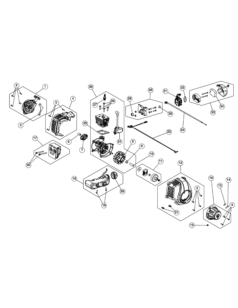 Rear engine cover assembly that houses and protects the engine area on gas string trimmers. Replace if cracked, broken, or missing for proper coverage.