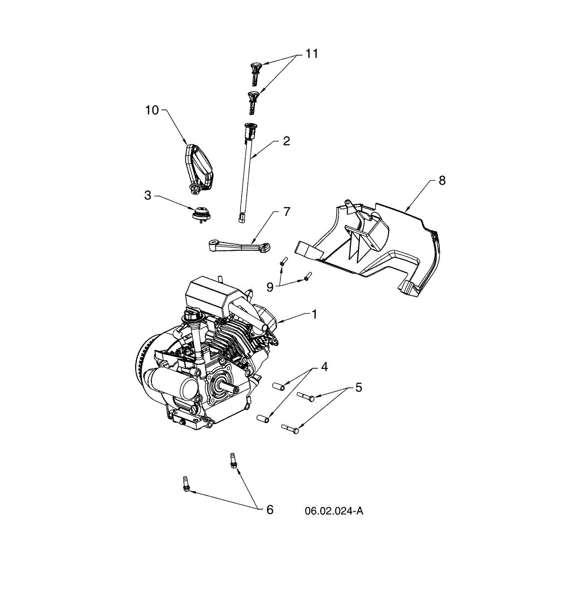 Hex thread rolling bolt with nut for gas trimmers, mowers, and snowblowers. Secures components through pre-drilled holes. Replace if missing or stripped.