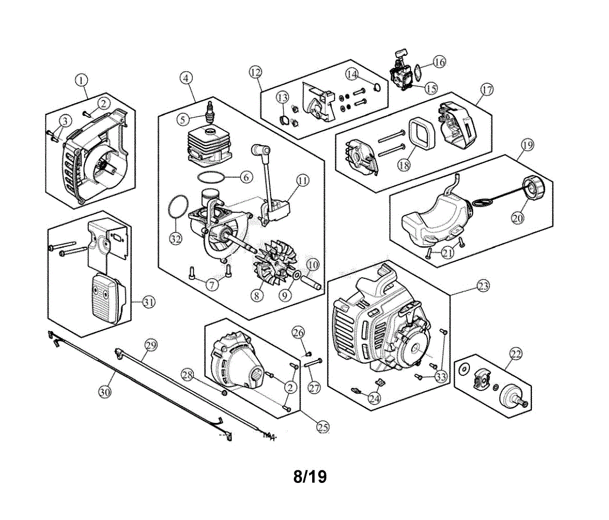 This is a short block assembly for a string trimmer. The short block consists of many of the engine components, including the cylinder and crank case, the piston and connecting rod, the crankshaft, the flywheel, the spark plugs, and the ignition module. T