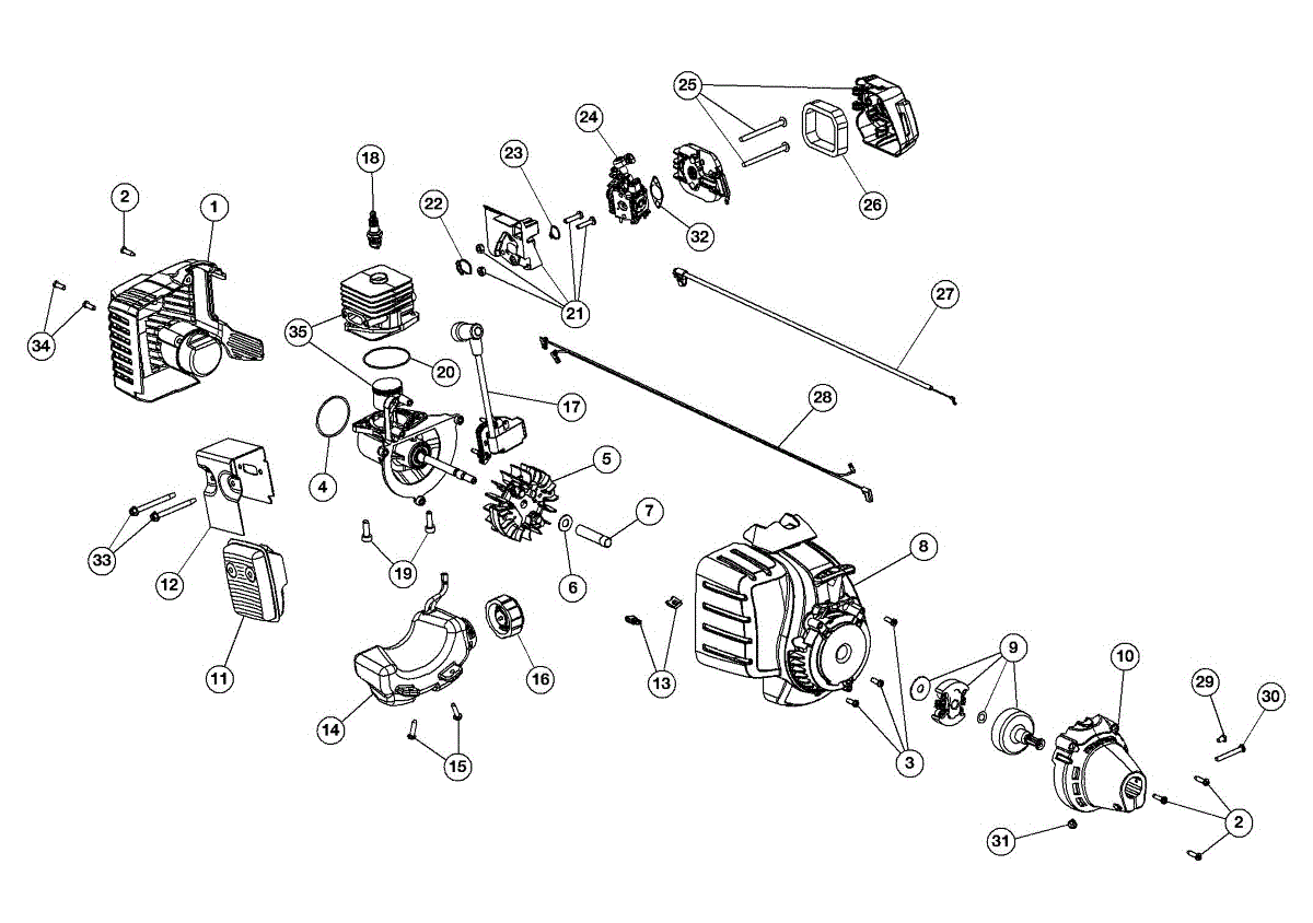 This is a short block assembly for a string trimmer. The short block consists of many of the engine components, including the cylinder and crank case, the piston and connecting rod, the crankshaft, the flywheel, the spark plugs, and the ignition module. This is a genuine OEM part and is sold individually. This assembly is compatible with Craftsman, Murray, Troy-Bilt, and Yard Man.A problem with any of the components of the engine will cause issues. For major failure of multiple components, the short block assembly contains all parts needed to repair the entire engine. Getting to the short block assembly requires taking the machine apart piece by piece. When removing the crankshaft, insert a 20-inch length of starter rope into the spark plug hole onto the piston, leaving some for removal. Using a wrench, rotate the clutch until the piston moves up and catches the rope, binding it and locking the crankshaft. When installing the new ignition module, be sure to use a spark plug gap spacer to ensure the proper gap between it and the magnets on the flywheel.