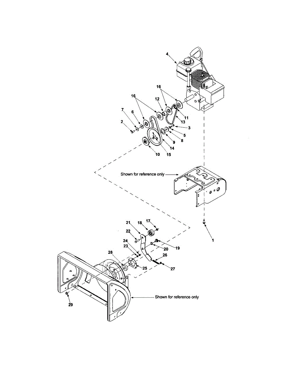 Drive belt connects engine to transmission on gas snowblowers. Replace when worn, cracked, or slipping to restore forward motion. Verify fit with model number.