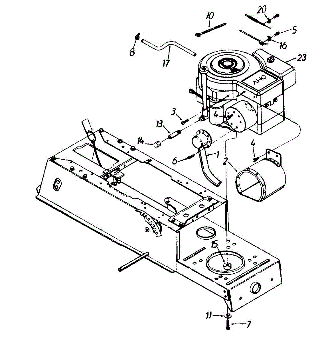 Hex screw fastener for securing lawn mower components. Replace if stripped, rusted, or missing to ensure proper assembly and equipment stability.