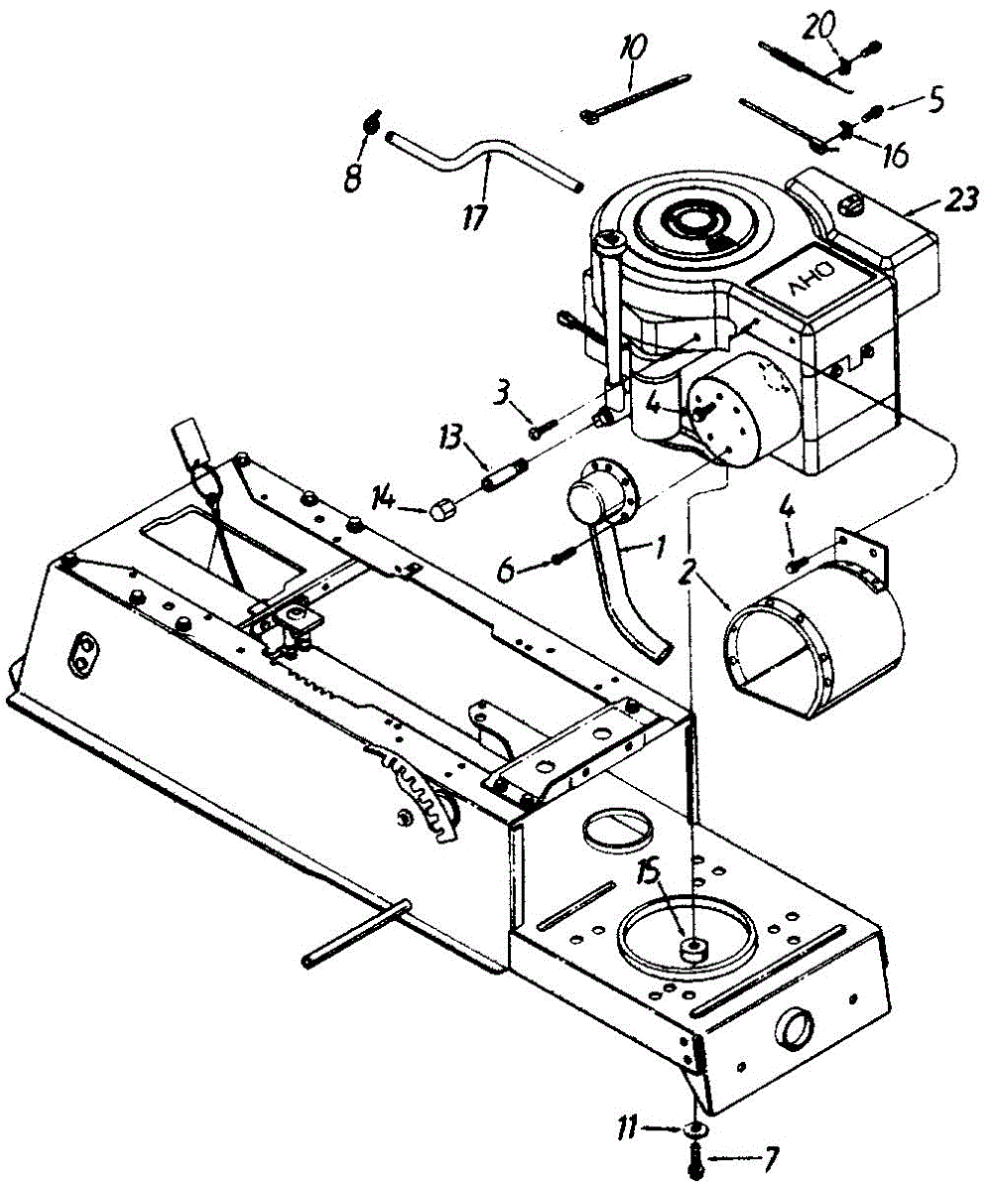 Hex screw fastener for securing lawn mower components. Replace if stripped, rusted, or missing to ensure proper assembly and equipment stability.