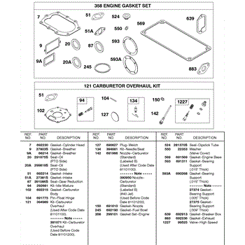 Parts for Briggs & Stratton 243431-0020-99: Engine Gasket Set, Carburetor Overhaul Kit Parts