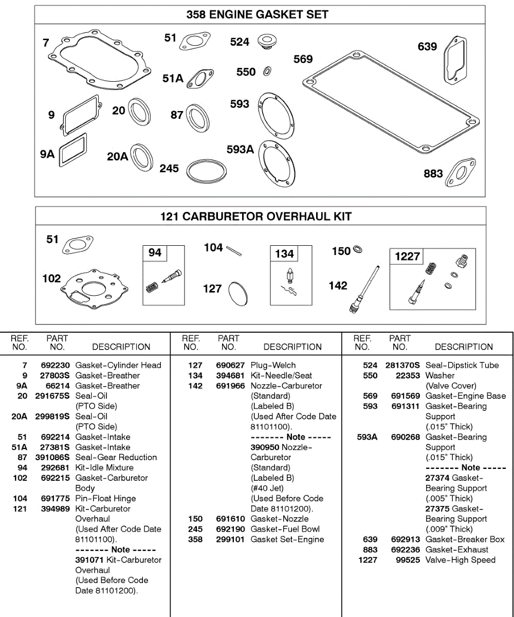 Parts for Briggs & Stratton 243431-0610-99: Engine Gasket Set, Carburetor Overhaul Kit Parts